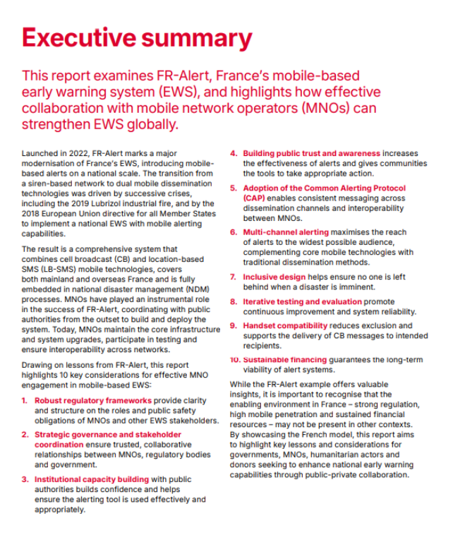 “MNOs have played an instrumental role in the success of FR-Alert, coordinating with public authorities from the outset to build and deploy the system.”